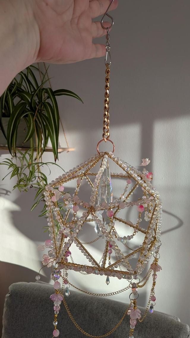Bring the magic of rainbows into your home with this handcrafted geometric suncatcher. Designed with a complex icosahedron brass-tone frame, this piece blends modern geometry with soft, romantic details. Each side is meticulously beaded with shimmering crystals and delicate pink blossoms, making it a beautiful statement piece even when the sun isn't shining.