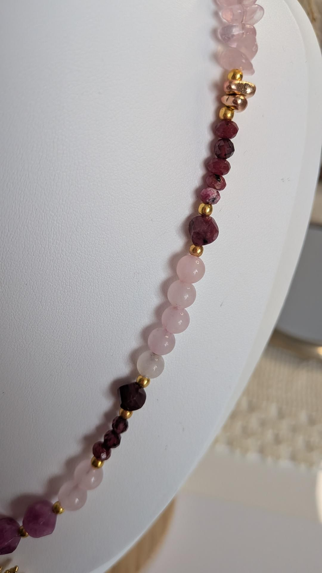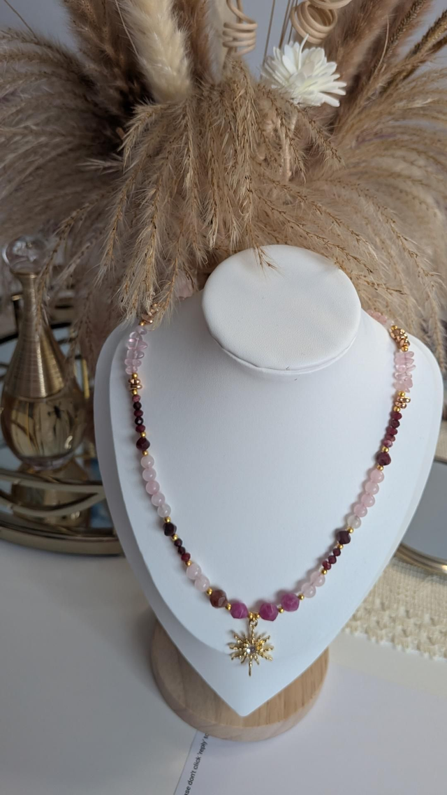 Embrace the energy of the cosmos with this hand-strung celestial masterpiece. This necklace features a harmonious blend of soft, translucent Rose Quartz—the stone of universal love—and deep, passion-fueled Ruby gemstones. Centered by a radiant, textured Sunburst charm, this piece is designed to be a wearable talisman of light, warmth, and heart-centered energy.Gemstones: Genuine Rose Quartz (smooth rounds and chips) and faceted Ruby beads (deep magenta/burgundy).