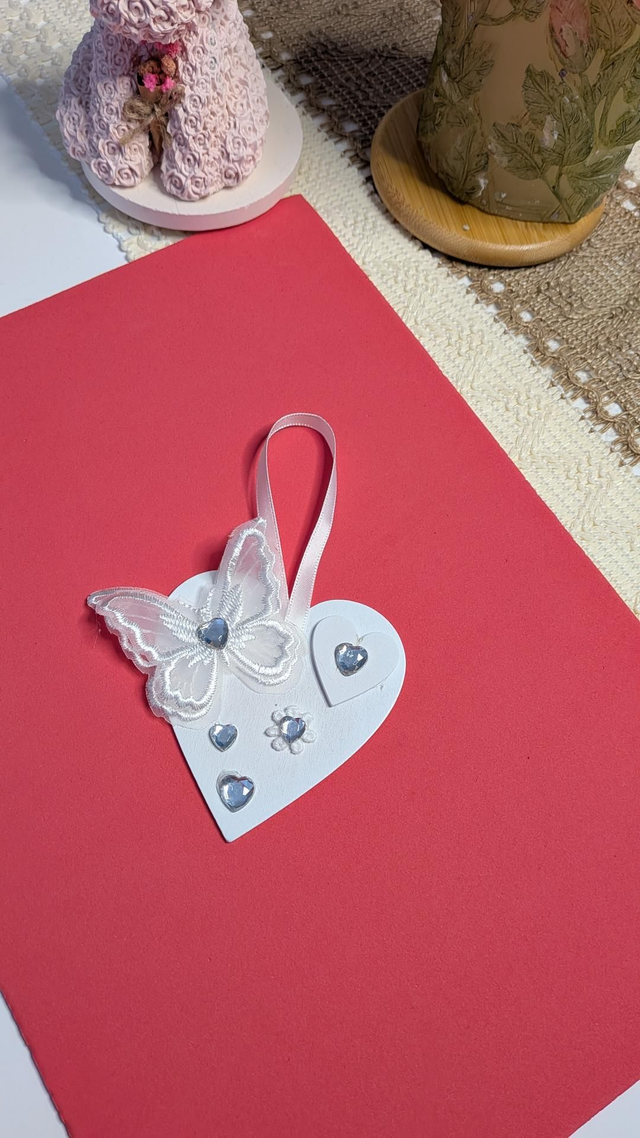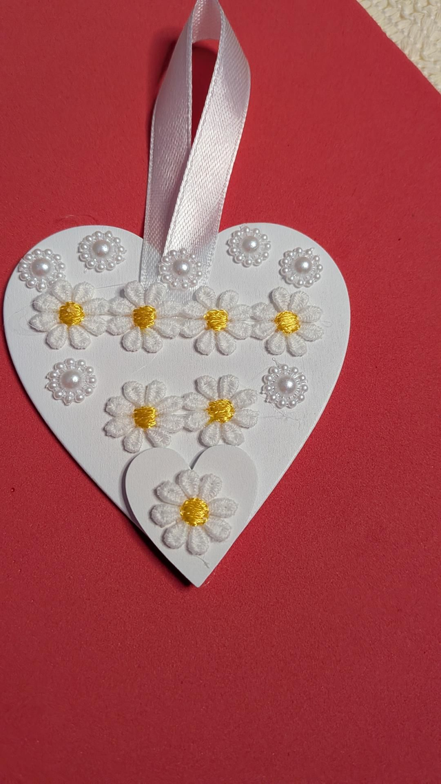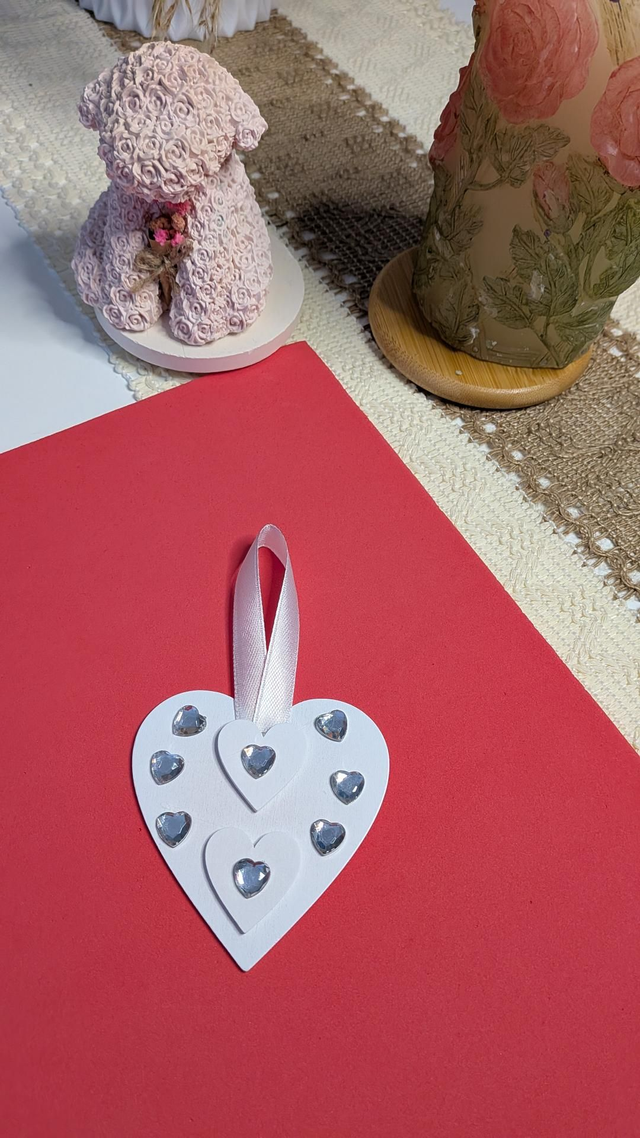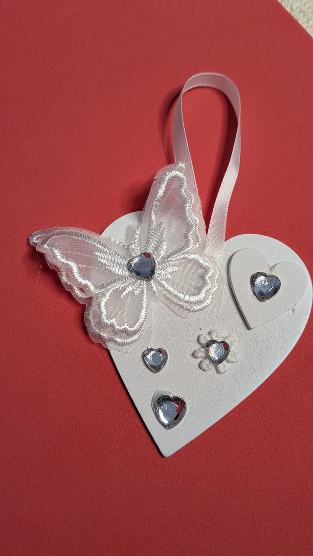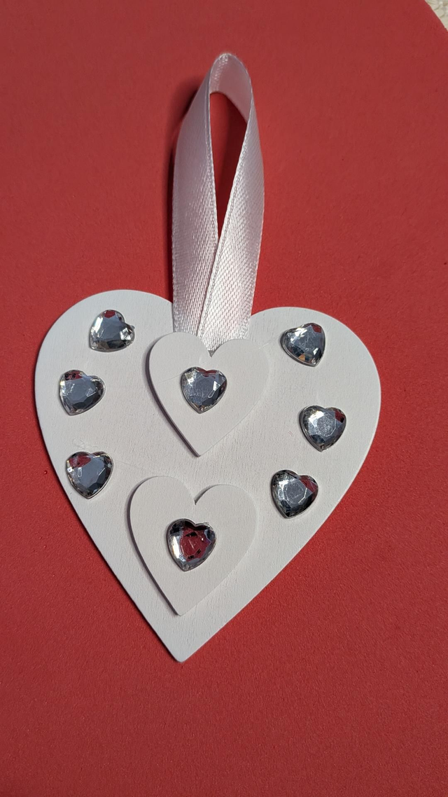 White wooden vintage style heart shaped hanging ornaments.